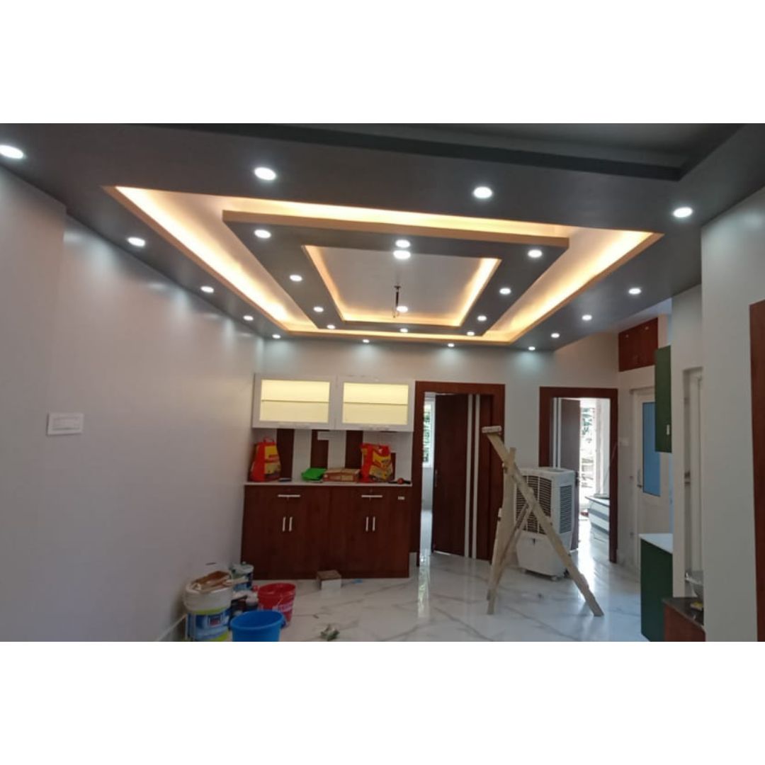 A false ceiling for a green's interior refers to a secondary ceiling installed below the main ceiling, designed to enhance aesthetics, provide insulation, and incorporate eco-friendly elements. In green interiors, false ceilings often use sustainable materials like bamboo, recycled wood, or gypsum, combined with energy-efficient lighting such as LED panels. These designs may include patterns inspired by nature, provision for indoor plants, or integration with ventilation systems to improve air circulation and reduce energy consumption, promoting a sustainable and stylish ambiance.