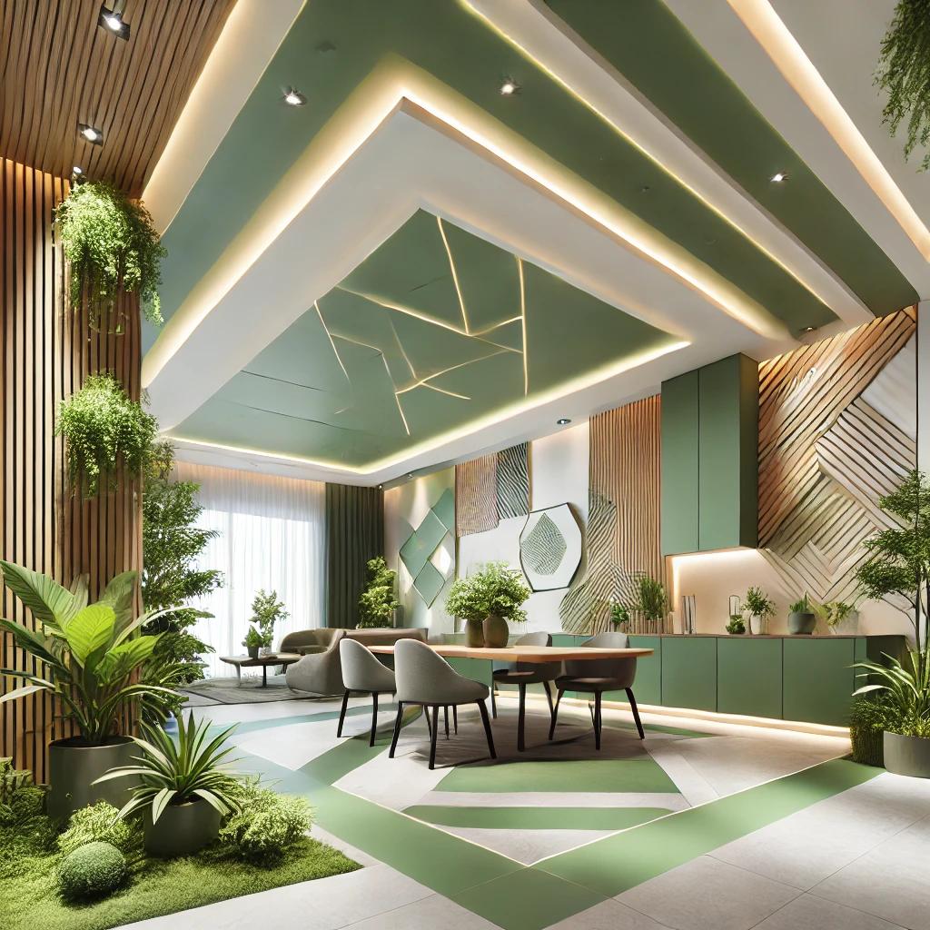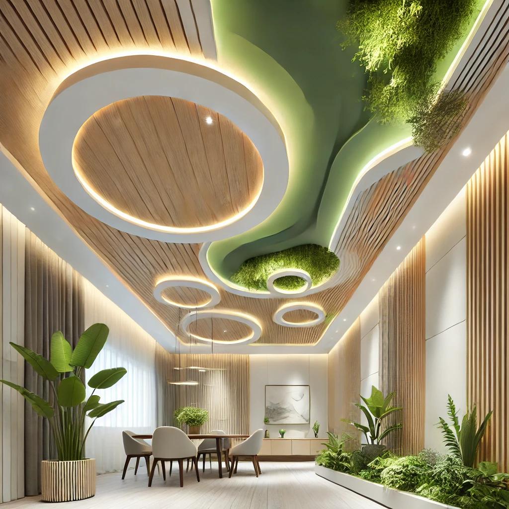 Eco-friendly false ceiling with wood, greenery, and natural lighting with greens Interior.